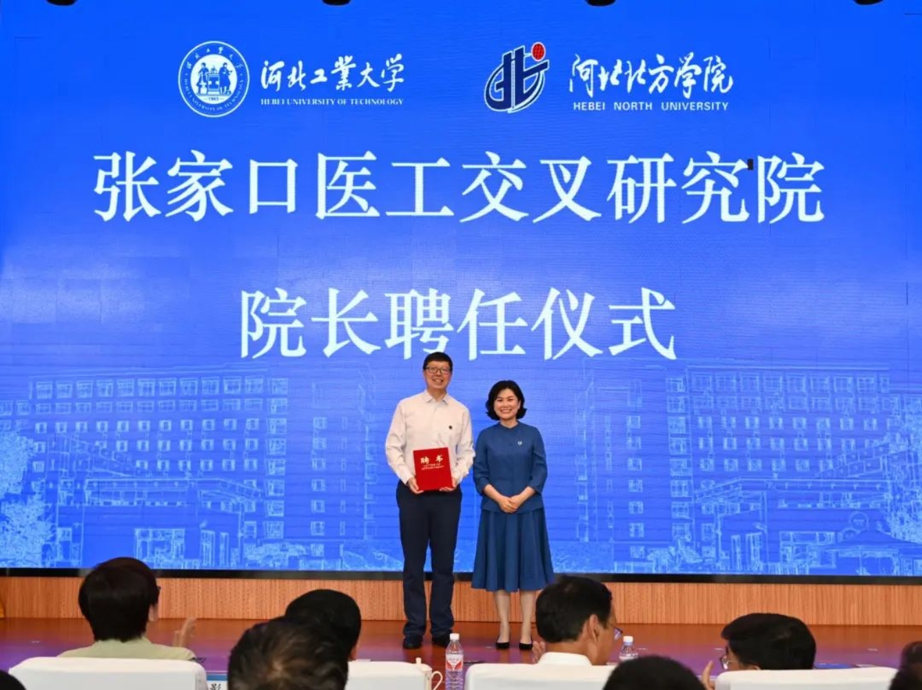 张家口市副市长闫利艳为张家口医工交叉研究院院长杨磊同志颁发了聘书、市卫生健康委、市科技局主要负责同志及两校相关部门、北方学院师生代表200余人参加会议。