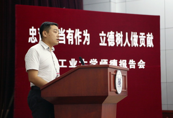 6月9日,由校工会、人事处、宣传部主办的“忠诚担当有作为、立德树立做贡献”师德报告会在行政楼一楼报告厅举行。校党委常委杨玉桢、校各职能部门及各学院负责同志出席。李春利、邢成芬、王秀娟、刘征和张丽红等五位老师从科研、教学、管理服务等方面,结合工作实践和切身感悟,诠释了什么是师德,什么是工大精神。报告会由兼职副主席张紫辉主持。