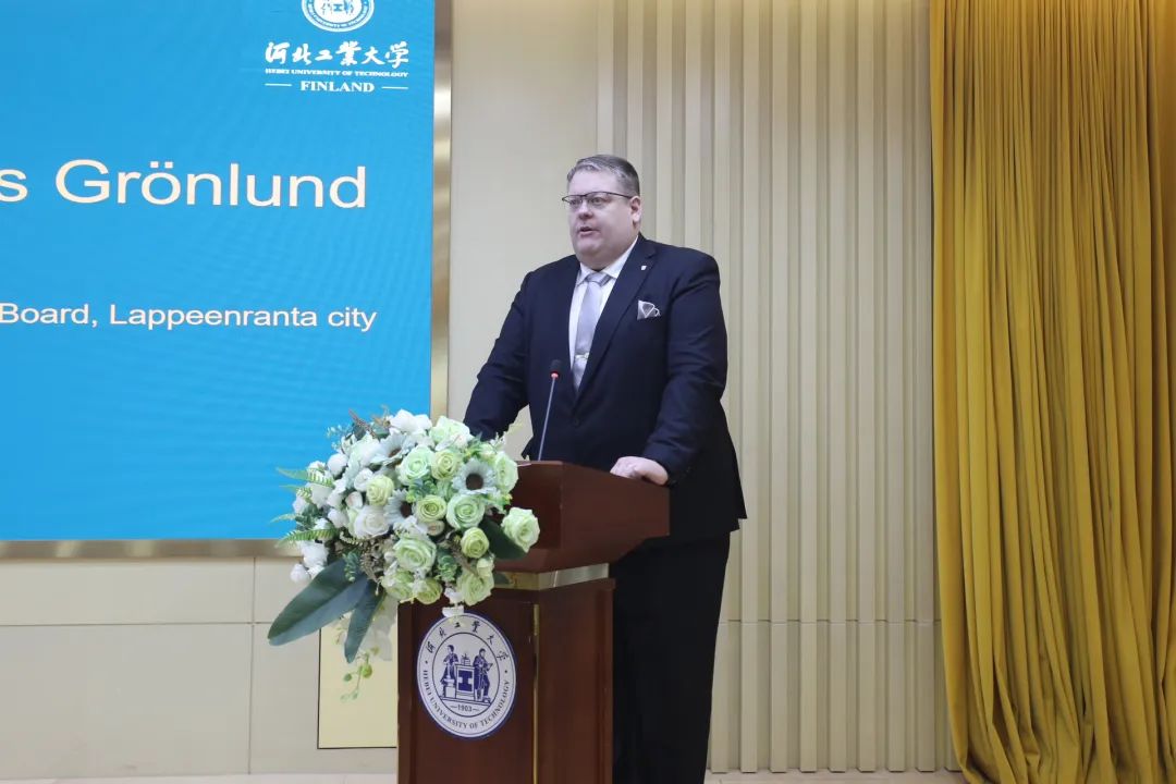 芬兰拉彭兰塔市董事会主席约纳斯·赫尔曼尼·格伦隆德(Joonas Hermanni Grönlund)先生在致辞中从拉彭兰塔城市建设、教育历史与LUT大学发展历程出发,回顾了芬兰教育体系的发展脉络,并展望了两校未来在多领域的合作,通过优势互补、资源共享,双方必将打造中芬高等教育合作的新典范,为应对全球性挑战贡献智慧与力量。
