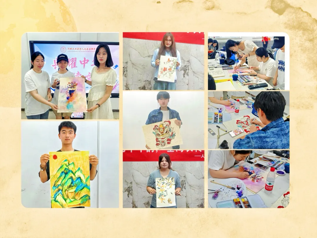 绘画组的同学们将传统文化与现代艺术风格融合,用水墨与彩绘展现山水花木、京剧脸谱、舞狮文化等中华传统文化的元素。新颖的构图和明快的色调,赋予传统文化全新的视觉语言,彰显出河北工大青年学子对传统艺术的深刻理解与创意传承。