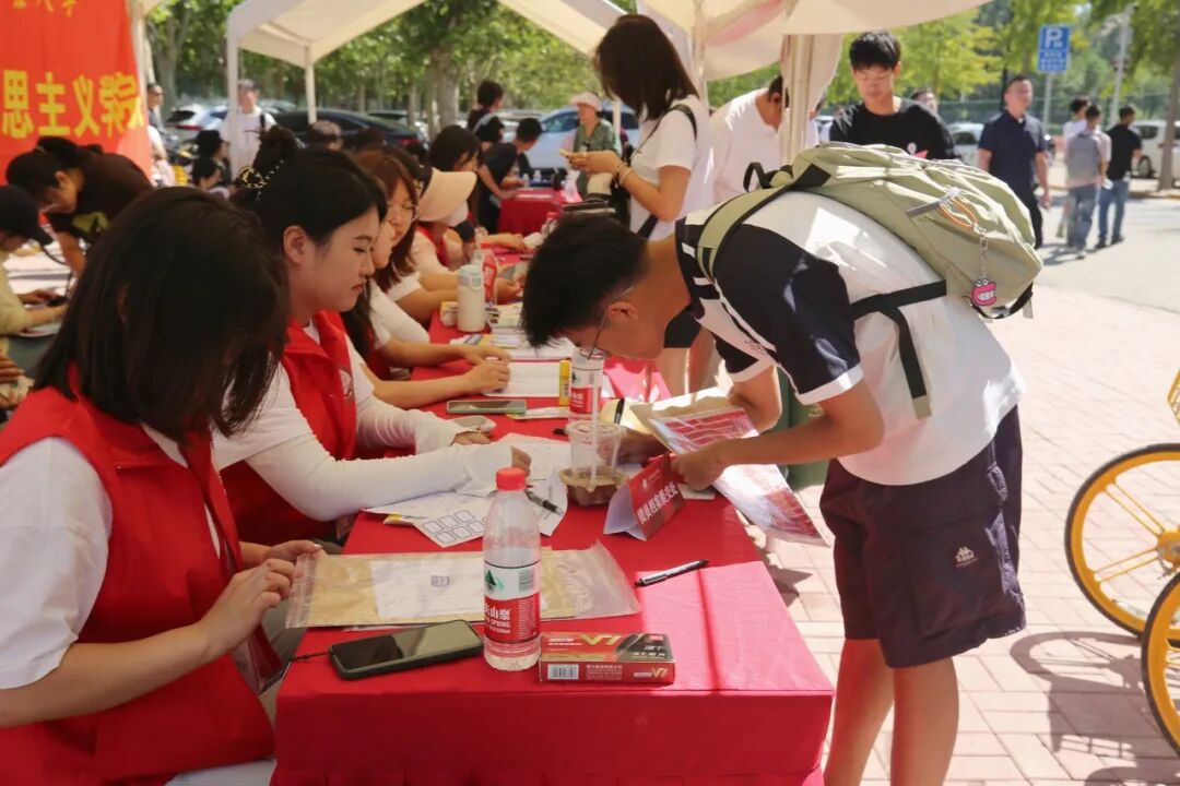 校门口,热情的志愿者接过行李,递上指南。学长学姐在身边微笑引路,为营造温馨、迅速的入校环境。各个学院提前规划了迎新点位,迎新志愿者细讲须知。