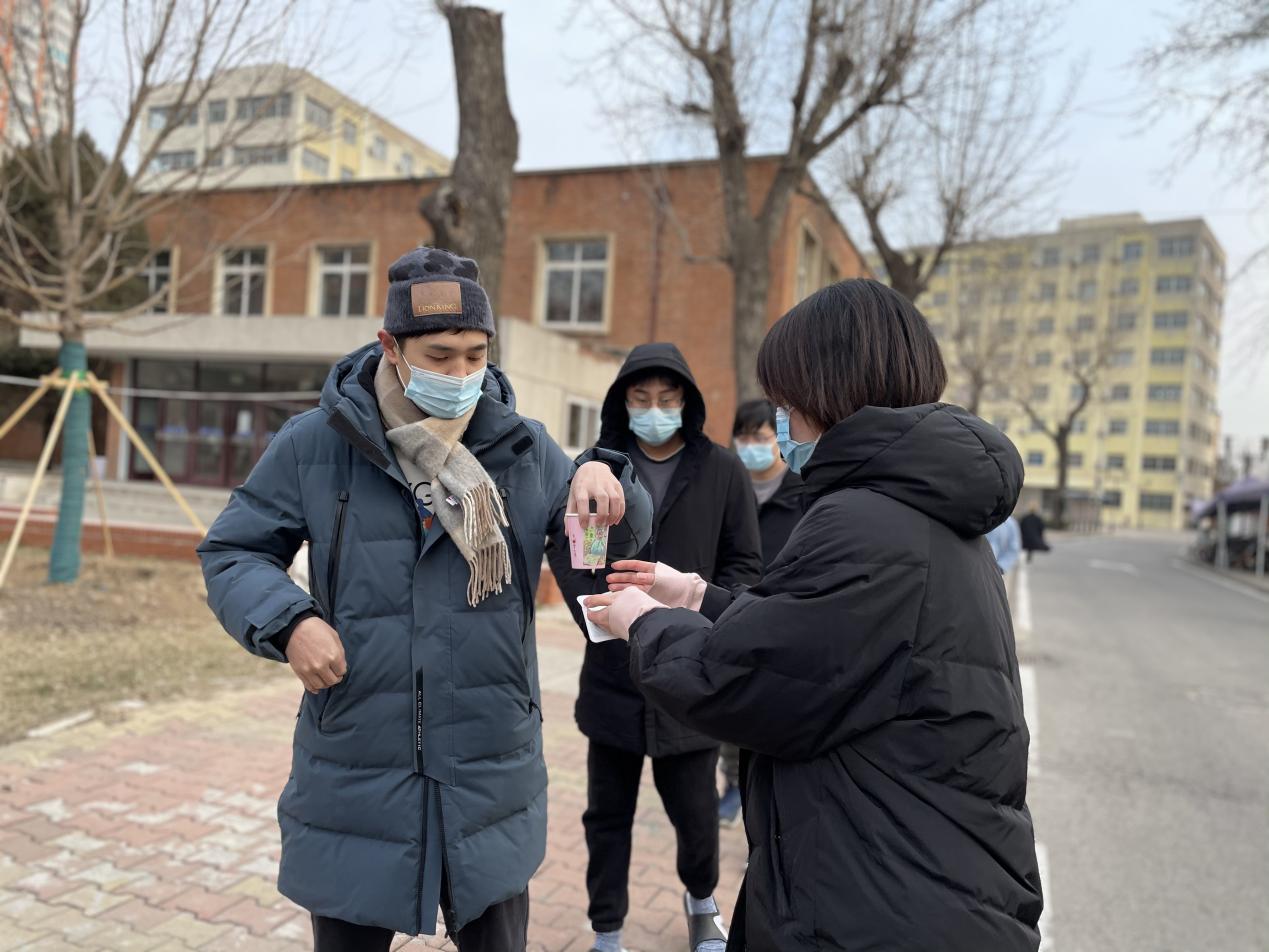 在核酸检测的等候现场,除了歌声,还洋溢着浓浓的“暖”意,传递着暖暖的温情。学院党委副书记兼副院长李睿给志愿者同学们分发提前备足的暖贴,让大家在志愿服务中保持温暖。志愿者同学们为排队同学们递上一杯热气腾腾的姜糖水,驱散冬日寒冷,暖手又暖心。