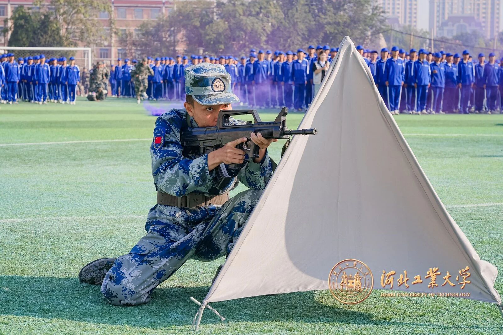 陈鸿雁称赞学生在军训成果展示中展现的朝气蓬勃的精神风貌。她表示,军训是块“磨刀石”,能培养学生成熟、坚强与友爱的品质,锤炼信念意志,为应对未来挑战奠基;她期望学生们将军训中的坚韧勇敢,融入大学时光,提升自我,为民族复兴彰显青春风采。