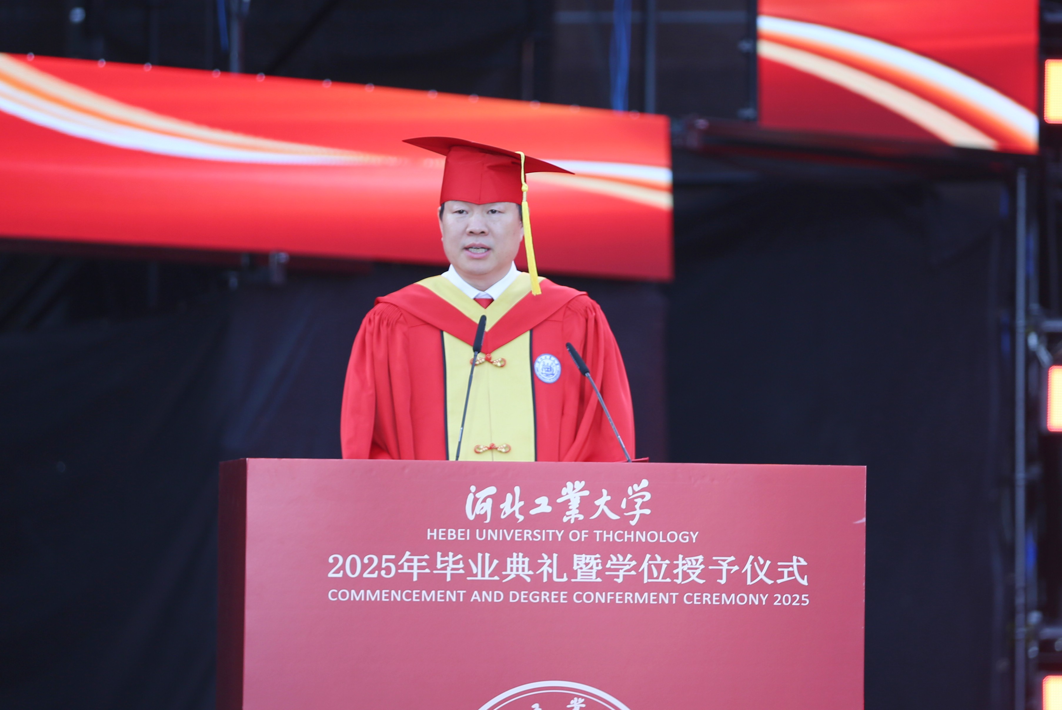 王利民说,作为幸运的一代,同学们生逢盛世,见证了国家的飞速发展和科技的巨大进步,领略了新质生产力磅礴奔涌的伟力;作为肩负重任的一代,同学们更身处百年未有之大变局,新一轮科技革命和产业变革蓬勃发展,深刻改变着生产生活方式,重塑着全球经济格局和社会形态。作为师长,他深情嘱托,希望大家永远有乐于探索未知的活力,去探索、去发现,在服务社会、报效祖国中绽放人生精彩;希望大家永远有勇于开拓创新的魄力,让工大人在推动科技发展,解决社会痛点的舞台上展现靓丽光彩;希望大家永远有坚守内心宁静的定力,在瞬息万变中找到属于自己的坚定从容。