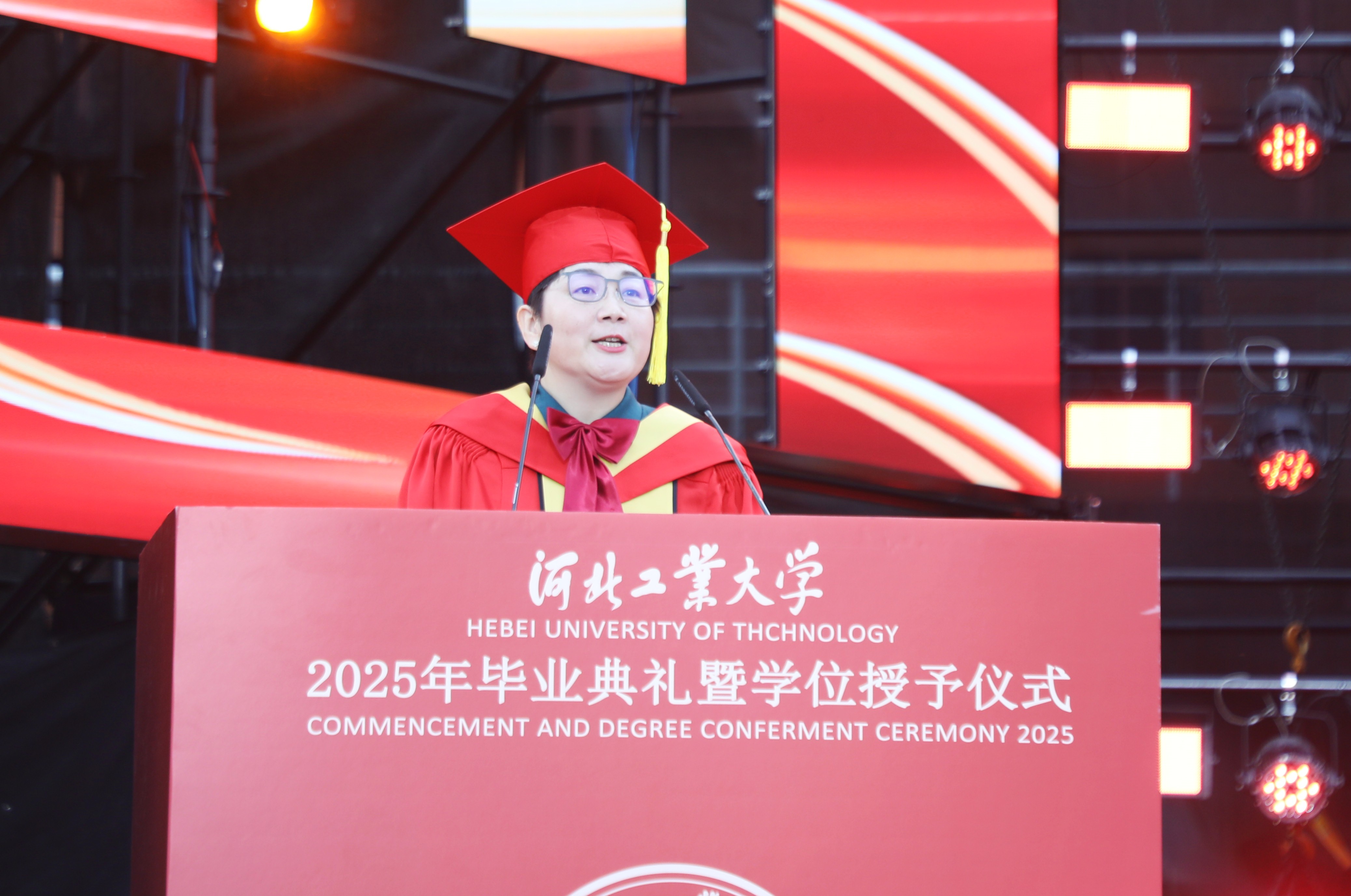 五星红旗伴国歌冉冉升起,毕业典礼在庄严的国歌声中拉开序幕。副校长、校学位评定委员会副主席王慧远宣读beat365英国官方网站2025届学位授予决定。