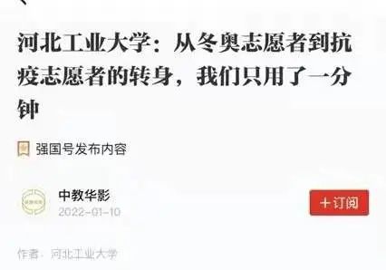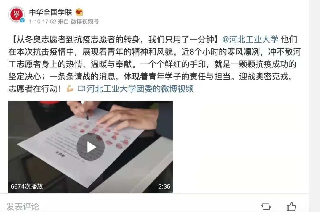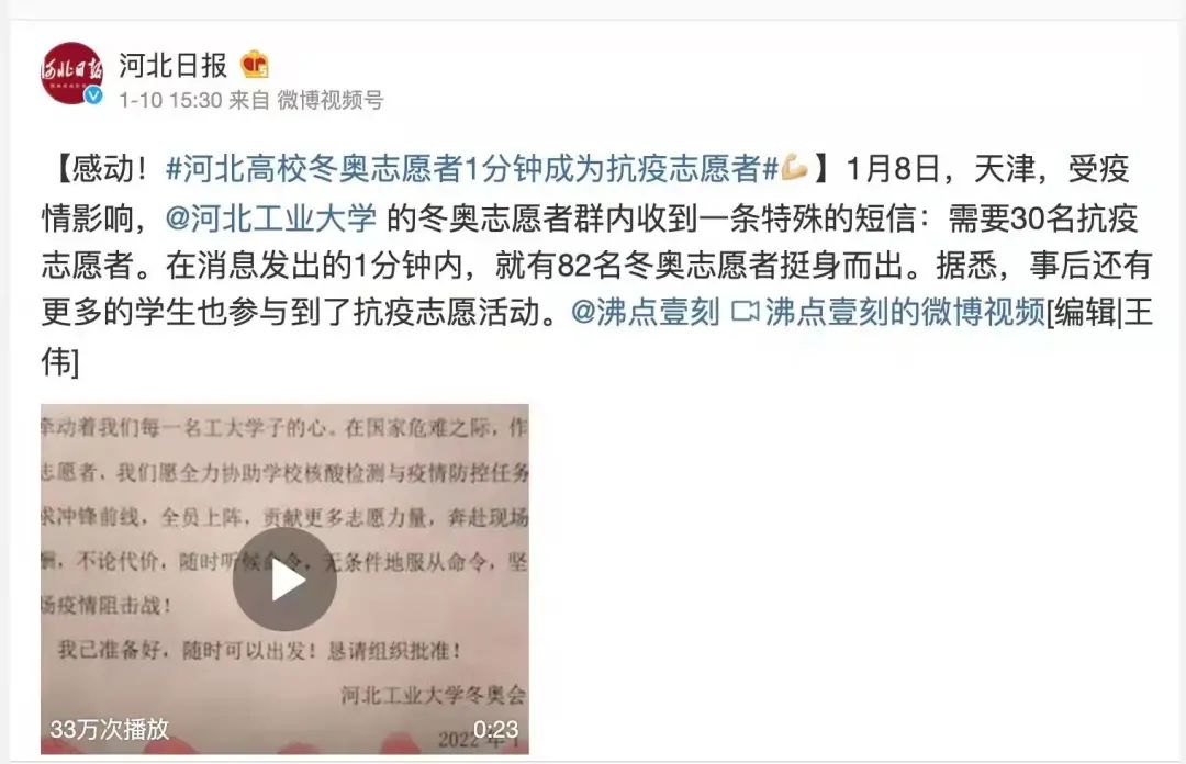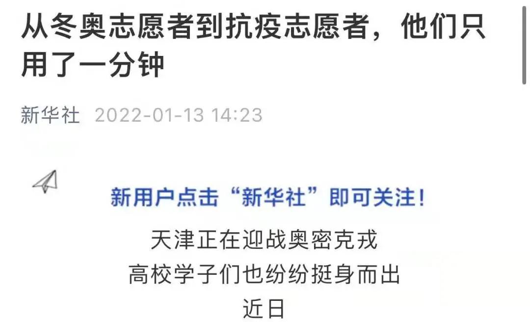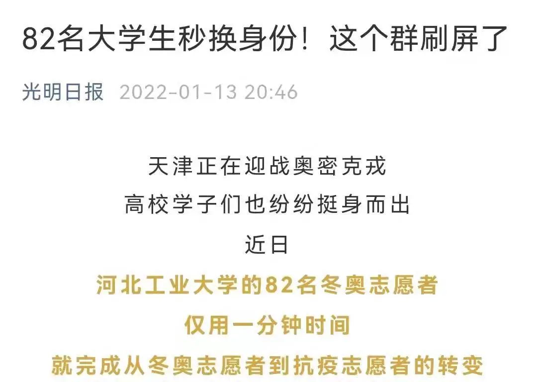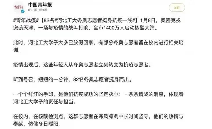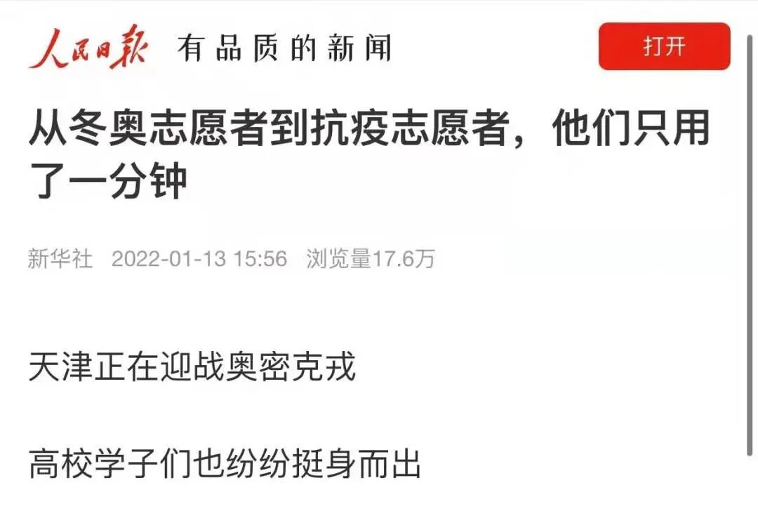 近日,一场与疫情的战斗在天津打响。关键时刻,冲锋在前,beat365官网冬奥志愿者挺身而出,争先报名抗疫志愿者,青春抗疫事迹受到多家主流媒体关注。新华社、人民日报、人民网、光明日报、学习强国学习平台、中国青年报、中国青年志愿者、中华全国学联、北京青年报、河北日报、扬子晚报、津彩青春、青春河北等主流媒体相继予以专题报道30余次,全网视频播放量约755.5万次,其中新华社单篇报道阅读量约111.7万次。