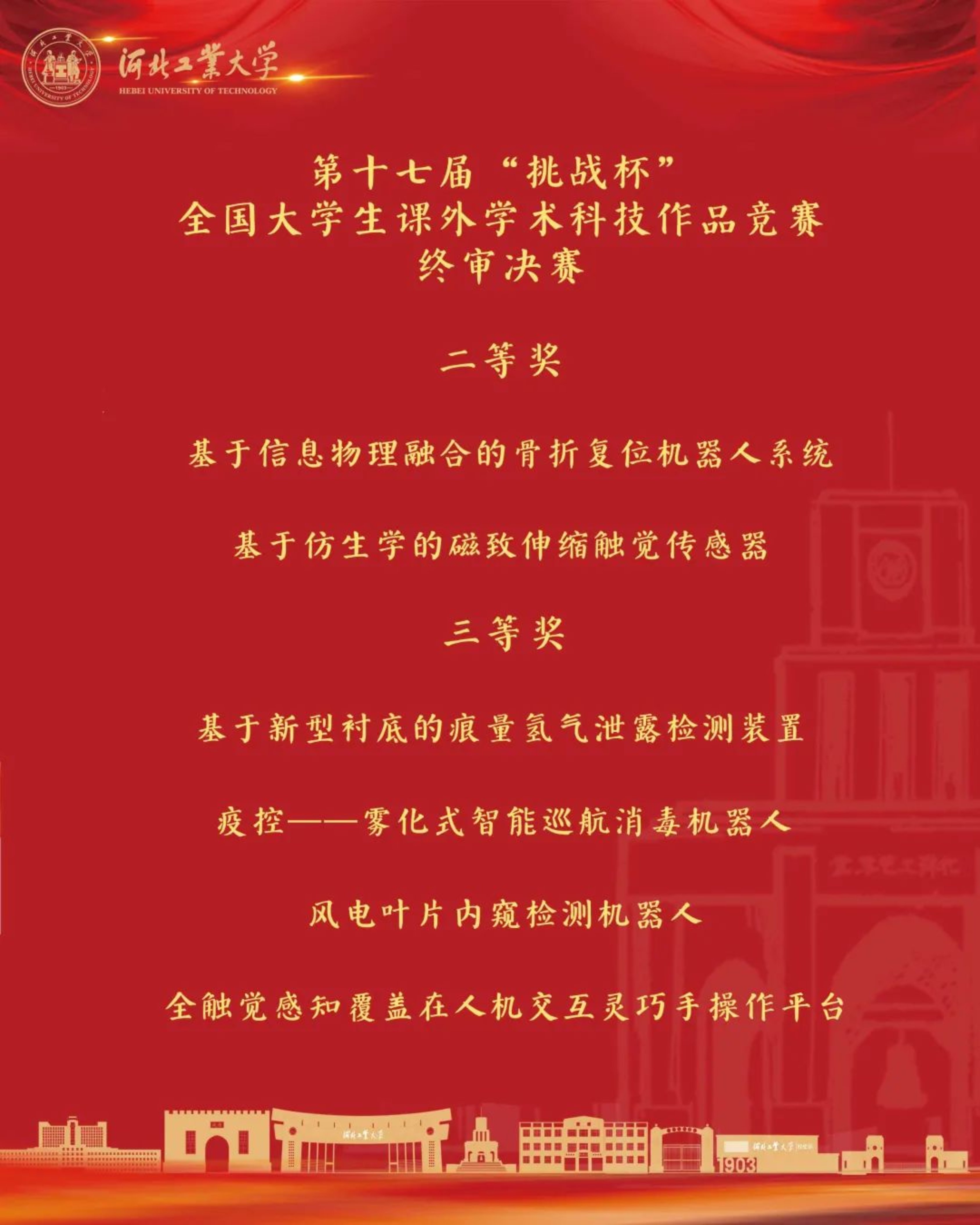 共青团中央、中国科协、教育部、中国社科院、全国学联和四川省人民政府主办、四川大学承办的第十七届“挑战杯”工商银行全国大学生课外学术科技作品竞赛落下帷幕。beat365官网所推报6项作品全部获奖,其中国赛二等奖2项,三等奖4项,总分160分,位列河北省第一,是beat365官网在“挑战杯”国赛中获得的最佳成绩。此外,红色专项赛beat365官网获得全国二等奖1项;翁玲老师获得国赛“优秀指导教师”称号。