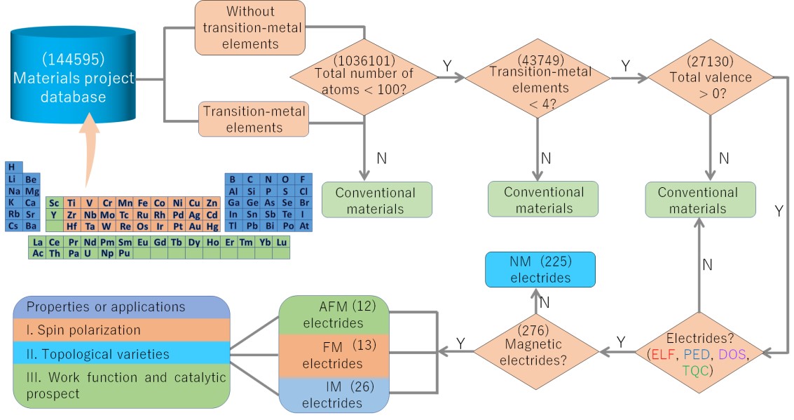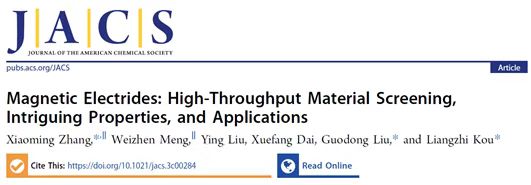 张小明教授、刘国栋教授与昆士兰科技大学寇良志教授等,历时近一年完成对磁性拓扑电子化合物的高通量材料筛选,从材料数据库中超过14万种材料出发,结合多种判断手段,共筛选出276种电子化合物,其中51种展现出铁磁、反铁磁与间隙磁性。此外,对所有磁性拓扑电子化合物的电子结构、拓扑物质态、功函数等性质进行了系统研究,并发现它们在电子发射器、促进催化氨合成等领域比惯常材料具有显著的应用优势。该工作是国际上首个对磁性拓扑电子化合物的材料筛选、物性与应用全方面系统性地研究工作,于2023年2月23日在国际顶级期刊Journal of the American Chemistry Society (DOI: 10.1021/jacs.3c00284)上在线发表。该成果第一作者为张小明教授,beat365官网博士研究生孟维真为共同第一作者,刘国栋教授和昆士兰科技大学寇良志教授为论文通讯作者。