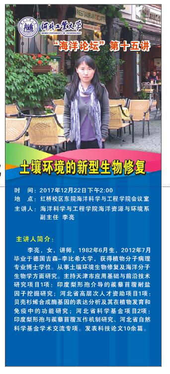 李亮,女,讲师,1982年6月生,2012年7月毕业于德国吉森-李比希大学,获得植物分子病理专业博士学位。从事土壤环境生物修复及海洋分子生物学方面研究。主持天津市应用基础与前沿技术研究项目1项:印度梨形孢介导的蒺藜苜蓿耐盐因子挖掘研究;河北省高层次人才资助项目1项:贝壳杉烯合成酶基因的表达分析及其在植物发育和免疫中的功能研究;河北省科学基金项目2项:印度梨形孢与蒺藜苜蓿互作机制研究、河北省自然科学基金学术交流专项。发表科技论文10余篇。