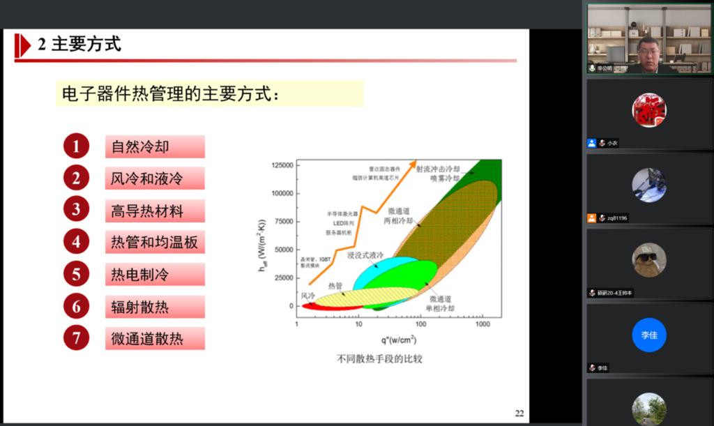 点击:2022年5月13日,山东大学能源与动力工程学院党委书记辛公明教授,应邀在线为我院师生作题为“电子器件热管理技术”的学术报告。会议由院长张强主持,金年会官网、能源学院、材料学院等200余名师生参加了报告会。