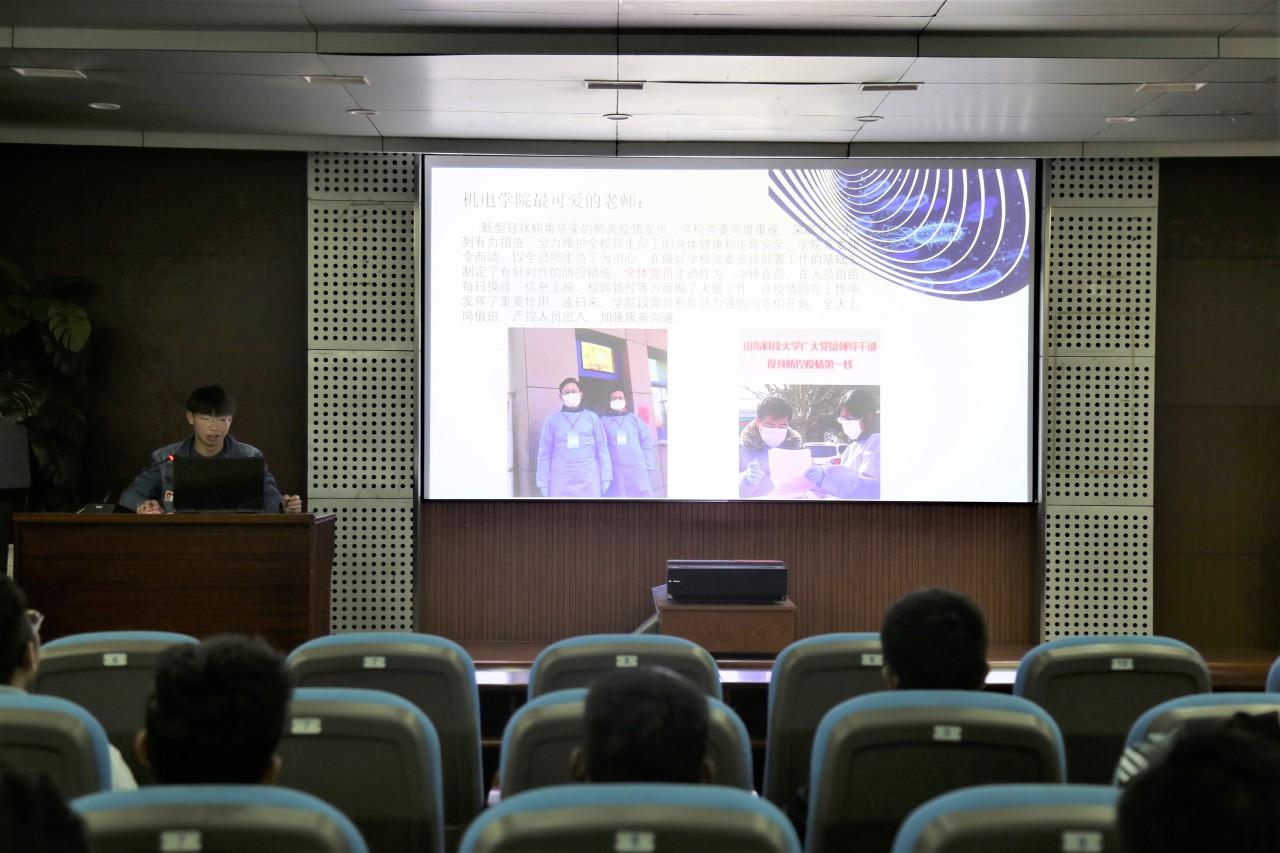 王正江介绍了金年会官网师生在疫情期间为学校、社区疫情防控进行的各项工作,特别讲述了机电学子在疫情期间积极参加各项志愿服务活动的优秀事迹,通过分享自身暑假时间到临沂市蒙阴县参加了“三下乡”社会实践活动,采访当地公安机关、社区网格化工作人员的所闻所感,向与会同学呈现了青年学子在疫情当中不畏艰险、共克时艰的精神。