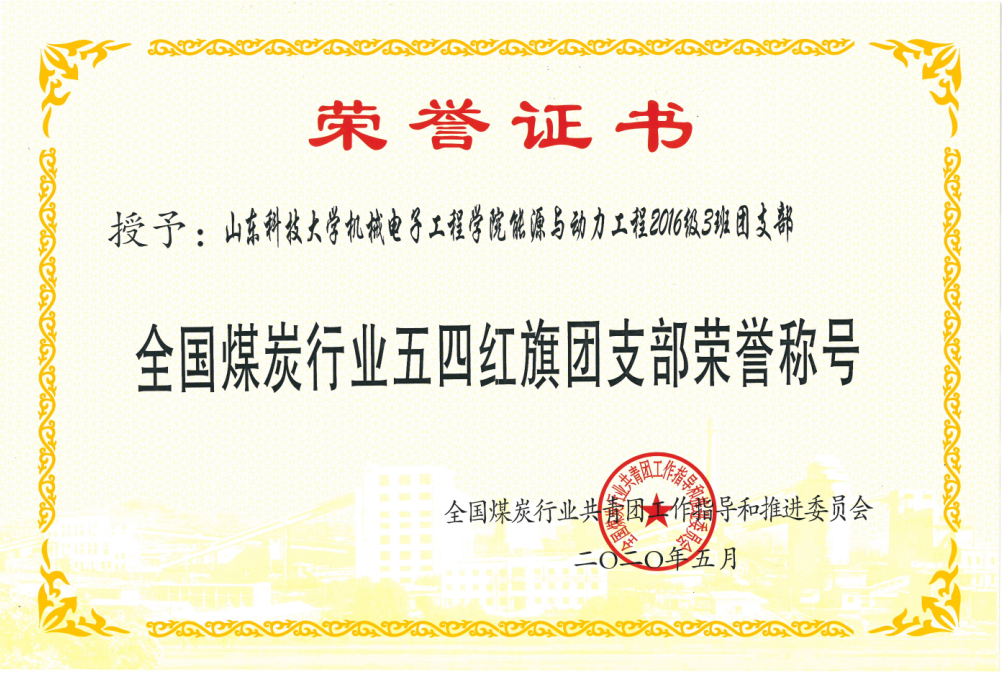 点击:日前,全国煤炭行业共青团工作指导和推进委员会对2019年度全国煤炭行业优秀团委(团支部)、团干部和共青团员进行了表彰,金年会诚信信誉至上金年会jinnianhuicom能源与动力工程2016级3班团支部荣获“全国煤炭行业五四红旗团支部”称号。