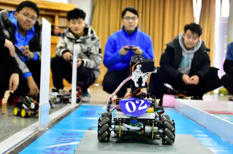 比赛采用机器人循迹越障取物与学校历史发展节点相结合的方式,参赛选手控制机器人的行进路线并越过障碍物,从“初创基业”(启动区)出发,依次经过“风雨兼程”(丛林区)、“改革发展”(桥梁区)、“开拓前进”(迷宫区),象征我校在发展过程中历经多次重大历史事件的考验与艰难曲折的洗礼,合舟共济、奋发有为,各项工作取得成就,最终到达终点“喜迎70华诞”,选手操纵机器人将“机关钥匙”搬运至终点进行堆叠,表达山科学子勤学笃行、以优异成绩回报母校的拳拳之心,最终堆叠误差小、用时少的选手胜出。