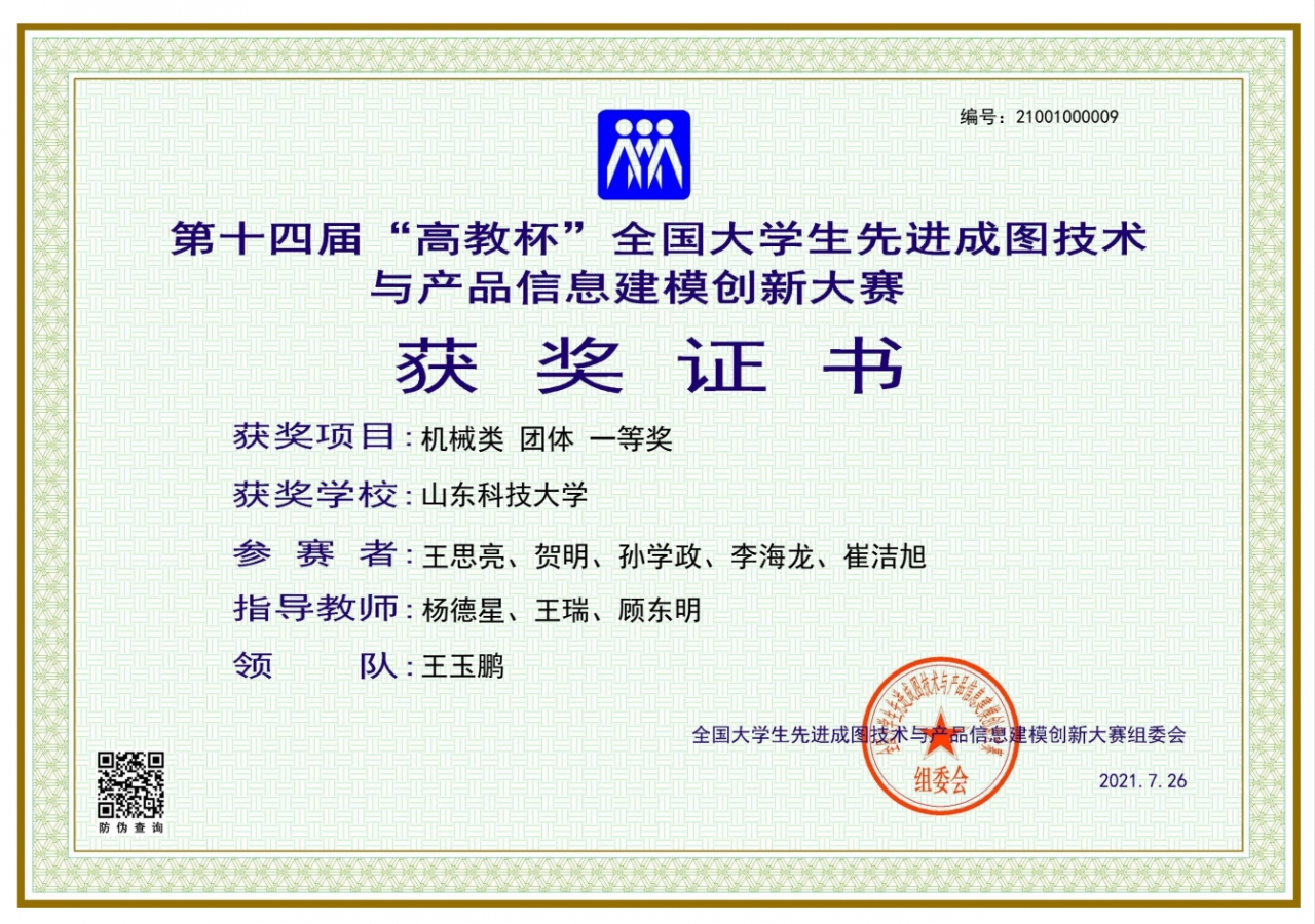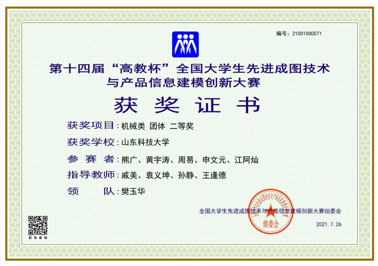 点击:近日,由全国大学生先进成图技术与产品信息建模创新大赛组委会、中国图学学会制图技术专业委员会、中国图学学会产品信息建模专业委员会、西南交通大学共同主办的第十四届“高教杯”全国大学生先进成图技术与产品信息建模创新大赛在西南交通大学顺利落下帷幕。经过激烈角逐,金年会诚信信誉至上青岛校区荣获团体一等奖1项、二等奖1项、三等奖2项,个人一等奖24项、二等奖5项、三等奖6项,其中我院荣获团体一等奖1项、二等奖1项、三等奖1项,个人一等奖24项、二等奖3项、三等奖1项。由王思亮、贺明、孙学政、李海龙、崔洁旭组成的机械类代表队(指导老师:杨德星、王瑞、顾东明,领队:王玉鹏)获得机械类团体一等奖,这是我院连续七年获得机械类团体一等奖。同时由熊广、黄宇涛、周易、申文元、江阿灿组成的机械类代表队(指导老师:戚美、袁义坤、孙静、王逢德,领队:樊玉华)获得机械类团体二等奖。我院还获得了制图基础知识一等奖1项、二等奖1项、三等奖1项,3D打印二等奖1项,inspire优化创新设计三等奖一项。同时,杨德星、王瑞、顾东明被评为“优秀指导教师”。