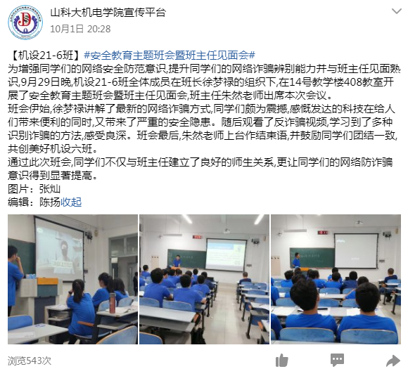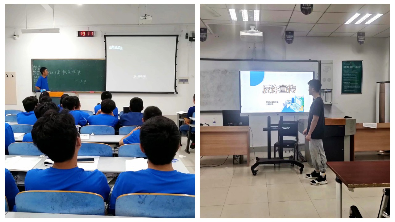 研究生开展安全教育主题班会 各班级通过多种形式的主题班会,引导同学们注册“国家反诈中心官方APP”、“反诈云盾”等安全软件,并通过学习大学生防范网络诈骗与非法集资学习资料、签署《主动学习反诈知识 拒绝电信网络诈骗》倡议书等多种途径,切实增强了我院学生安全防范意识和避险能力,而且对保障同学们的人身财产安全具有重要意义。