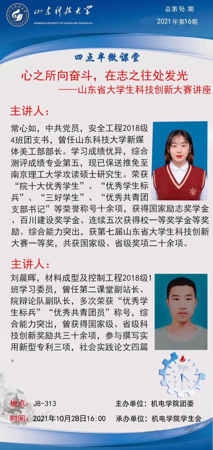 点击:为了激发学生对科技创新的兴趣,提升参赛能力,10月28日下午,金年会官网在j8-313举办了“心之所向奋斗,在志之往处发光”山东省大学生科技创新大赛讲座暨第95期四点半微课堂,安全学院安全18-4班团支书常心如、金年会官网材料18-1班学习委员刘晨辉担任主讲人。