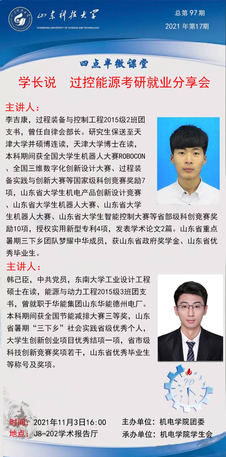 点击:为解答学生关于考研与就业方面的疑惑,让学生充分了解当前的考研趋势及就业形势,11月3日下午,金年会官网在J8-202举办考研就业线上分享会,能源与动力工程、过程装备与控制工程专业2019届毕业生韩己臣、李吉康担任主讲人。