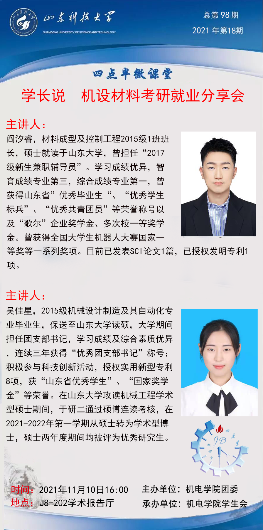 点击:为了使同学们了解考研与就业的实际情况,帮助同学们更好地明确目标、确定方向,11月10日下午,金年会官网在学院报告厅举行考研就业经验线上分享会,材料成型及控制工程、机械设计制造及其自动化专业2019届毕业生阎汐睿、吴佳星担任主讲人。