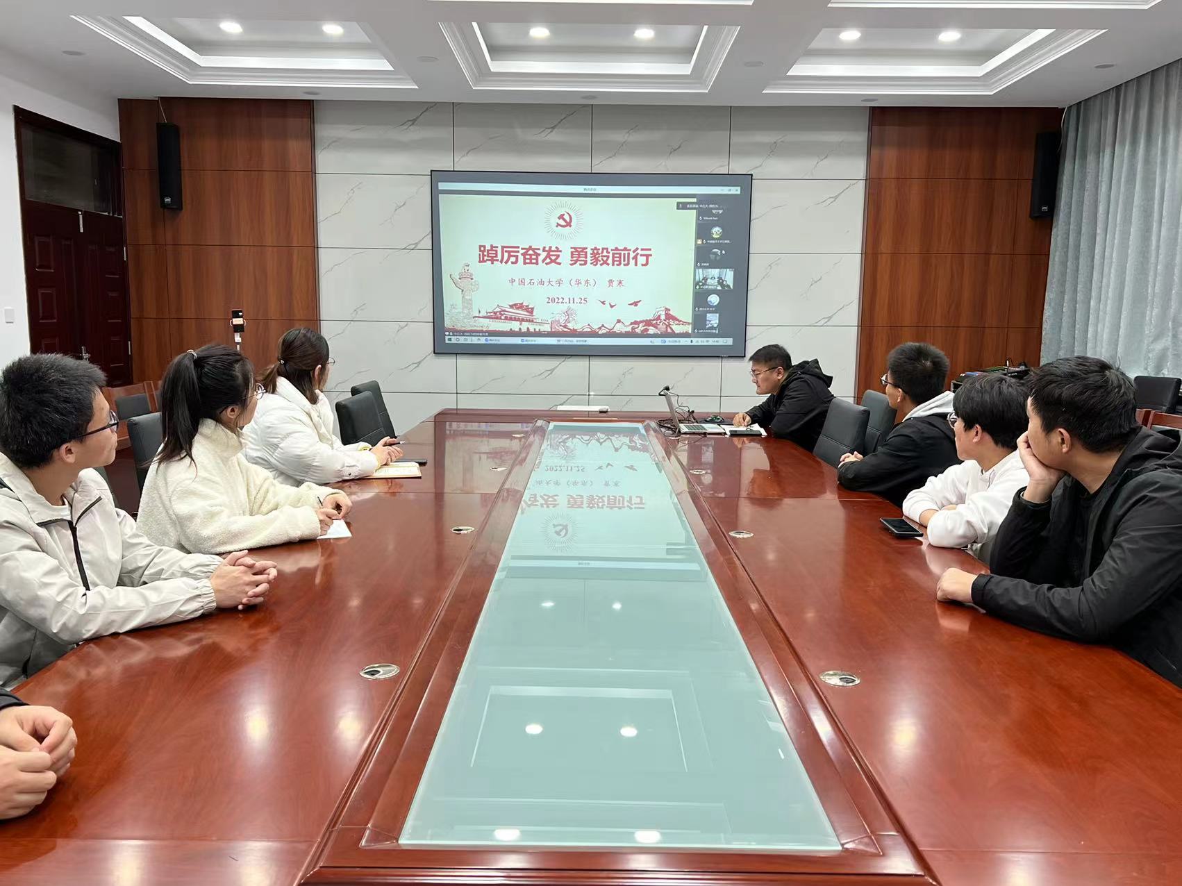 点击:为深入学习贯彻党的二十大精神,以实际行动传承红色思想、弘扬红色精神,同时加强高校之间的交流互动,持续建立学院与其他高校之间的联系,11月25日,金年会官网小平科技创新团队党支部、能源20-2团支部部分代表与中国海洋大学、四川大学、中国石油大学和潍坊理工学院相关老师、团队负责人共同开展“高举伟大旗帜,汇聚磅礴力量”党的二十大精神学习交流会活动,中国海洋大学红旗智援博士团党委书记刘笑笑、中国石油大学(华东)石油工程学院教授贾寒、金年会官网团委书记樊玉华出席本次活动。
