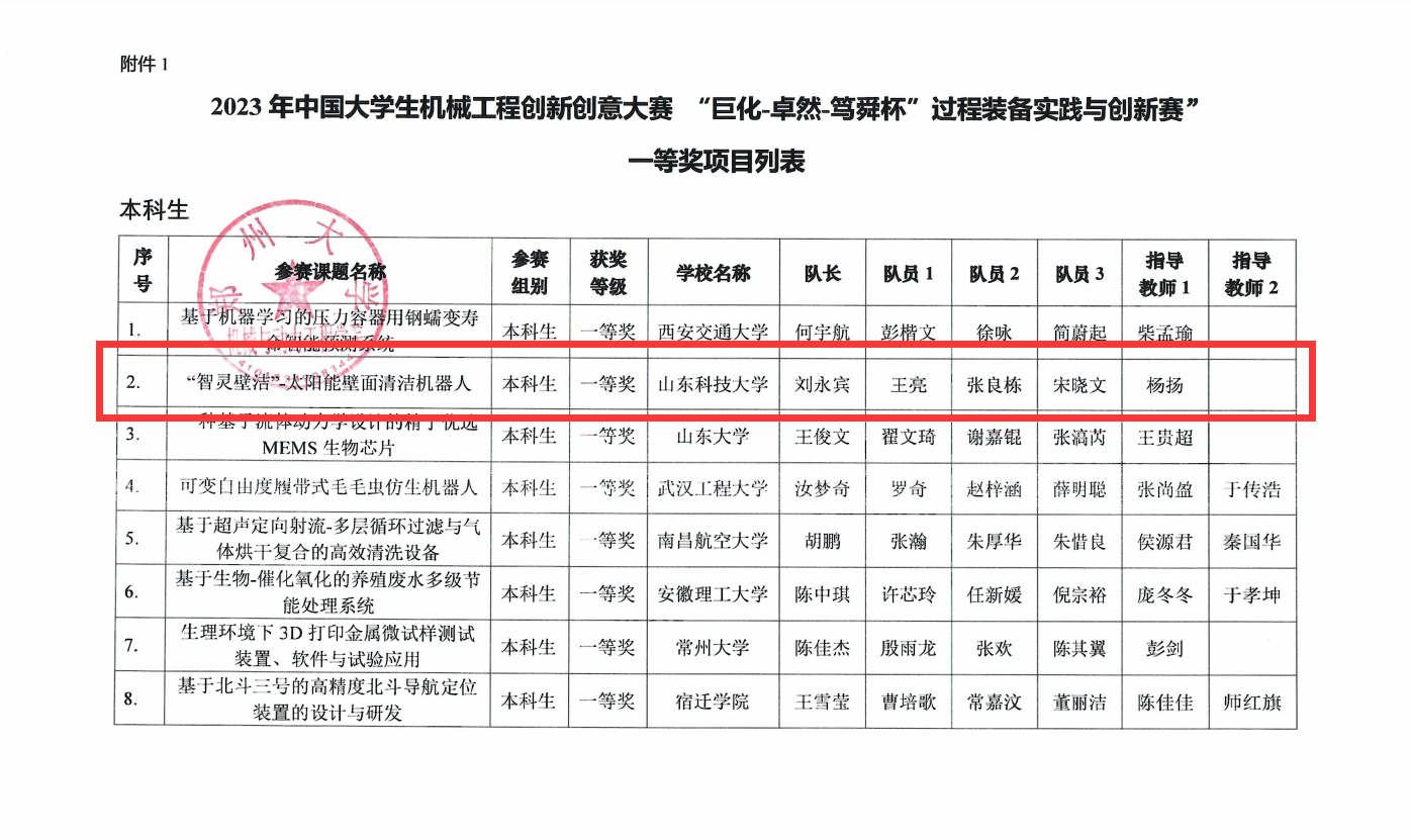 点击:8月26日,由中国机械工程学会主办,郑州大学承办的的中国大学生机械工程创新创意大赛系列赛事——“巨化-卓然-笃舜杯”过程装备实践与创新赛总决赛落下帷幕。经过激烈角逐,我院学子斩获国家级一等奖1项、二等奖4项、三等奖2项,杨扬老师指导的项目《“智灵壁洁”-太阳能壁面清洁机器人》荣获国家一等奖。