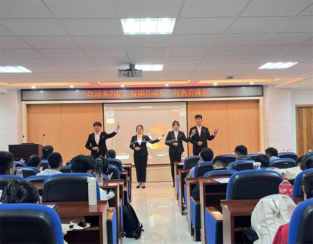 活动伊始,“梦耀中华”服务宣讲团成员侯兰琪演唱《我和我的祖国》,以青春之声展现个人与祖国之间的紧密联系,表达对祖国热爱与祝福。随后,宣讲团从军民齐心攘外敌、民心所向奔解放、敢教日月换新天、党群同心战疫情、吾辈青年当自强五个方面,声情并茂的阐释了“水乳交融、生死与共”的沂蒙精神。宣讲结束后,曹润雨、刘怡漩共同朗诵《百年》,用最简洁的朗诵,歌颂了中国共产党苦难中铸就辉煌、探索中收获成功、失误后拨乱反正、奋斗中赢得未来的一百年。宣讲团的精彩演绎赢得了在场学生的阵阵掌声,大家纷纷表示要学好红色文化,传承好红色基因,以此激励自己更加自觉地传承、发扬党的光荣传统。