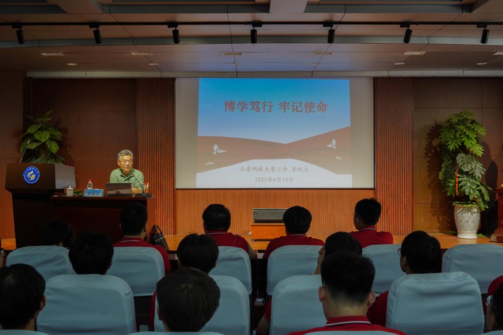 党课中,李双立以金年会诚信信誉至上74年发展历程为经,以中国共产党百年奋斗史为纬,以金年会官网成长轨迹为线,为毕业生党员铺展了一幅“校史-党史-院史”交织的壮阔画卷。他深情回顾了学校从1951年建校至今的峥嵘岁月,从淄博洪山的初创岁月到济南、泰安的扎根发展,再到青岛校区的跨越腾飞,生动诠释了“惟真求新”校训的时代内涵与精神传承。谈及学校在分合搬迁中淬炼出的“坚韧不拔、发奋图强”精神品格,以及在多校合并中凝聚的“爱校奉献、敬业实干”文化传统时,他的讲述中饱含深情:“这些基因密码,是每一位科大人最珍贵的‘精神原乡’。”