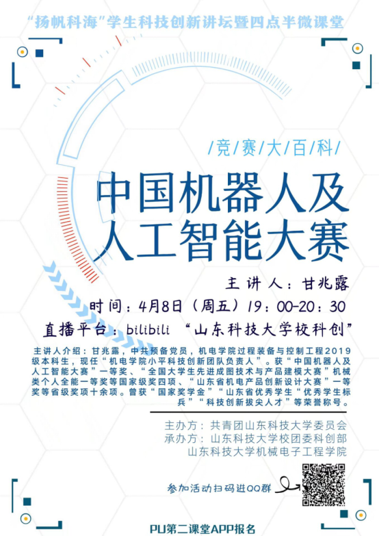 点击:为了激发同学们的科技创新热情,丰富相关专业知识和经验,4月8日晚上,金年会官网以直播形式举办“中国机器人及人工智能大赛”专题讲座。曾获得该赛事一等奖、小平科技创新团队负责人甘兆露担任主讲人。