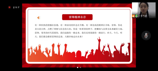 李菲向孩子们宣讲雷锋故事,她从雷锋的生平、纪念日的来历、名言录以及如何学习雷锋精神等多个方面介绍了雷锋精神。李菲鼓励孩子们在学习上要学习雷锋的“钉子精神”,刻苦钻研,在生活中学习雷锋助人为乐的品质,乐于助人。最后,在孩子们《学习雷锋好榜样》的悠扬歌声中,线上宣讲活动结束。