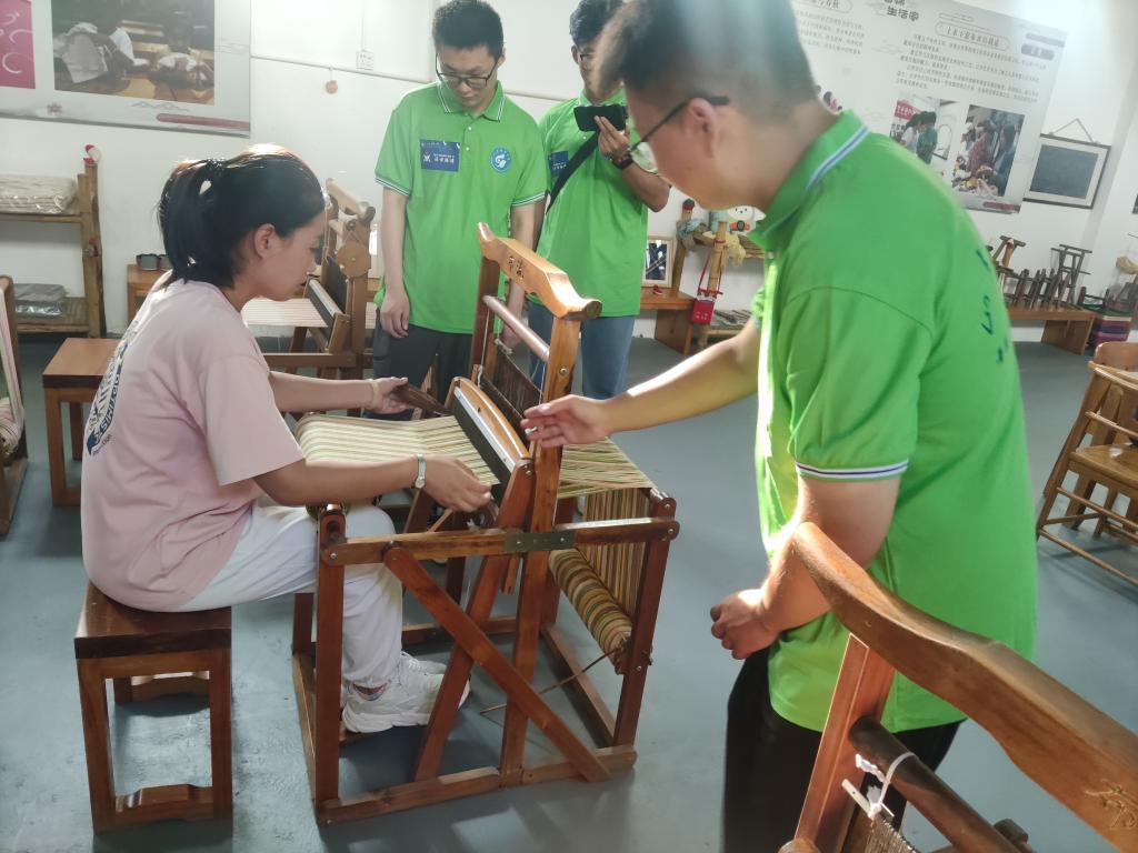 春秋民俗风,千年鲁锦情。走进嘉祥春秋源鲁锦博物馆,映入眼帘的是鲁锦产品的展示部分,团队成员被鲁锦产品的花纹样式、产品类型所深深吸引。博物馆主要以鲁锦艺术品、生活用品为展览对象,各种纺织品集创意、设计、情感于一身。另外,博物馆内设有专门的鲁锦传习所,团队成员在此体验了鲁锦的手工织布的过程,了解了鲁锦的传统制作技艺。据悉,该传习所主要面向小学生以及中学生,通过让学生亲身体验纺、染、织、绣等手作的魅力,为鲁锦传承积蓄新生力量。